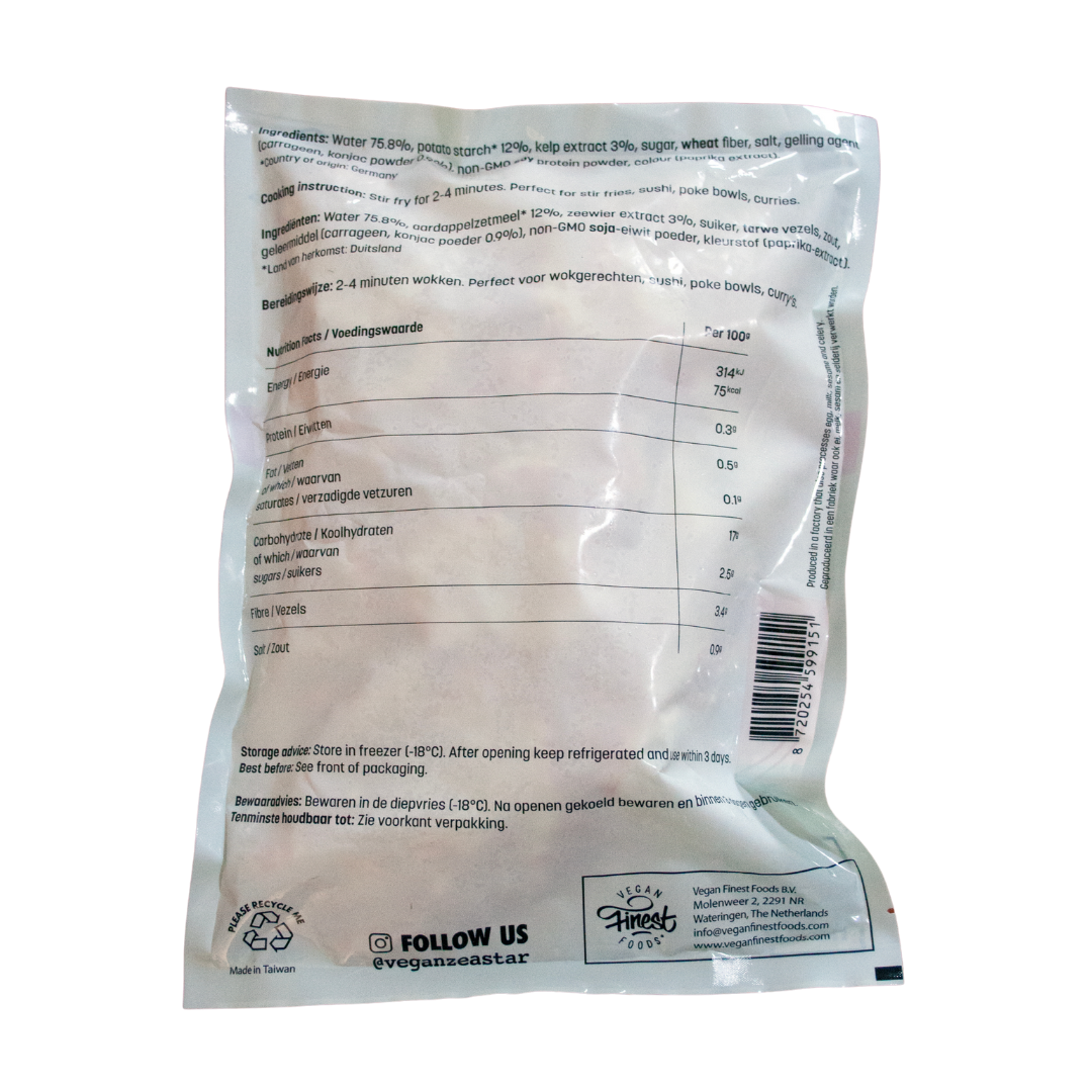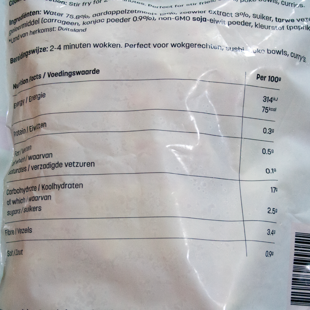 Acqua, fecola di patate, estratto di alghe, zucchero, fibra di grano , gelificante (carragenina, polvere di konjac), sale, polvere di proteine di soia non OGM , colorante (estratto di paprika).