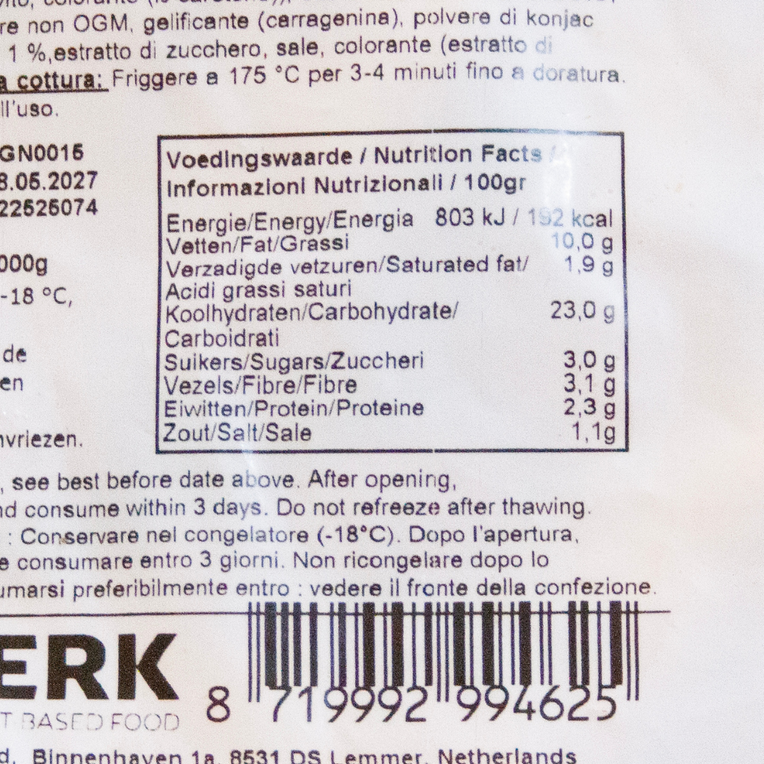 Acqua, fecola di patate, pangrattato ( farina di frumento , acqua, olio di cocco raffinato, sale, polvere di soia , lievito, amido di mais, agente di trattamento della farina (solfato di calcio, bicarbonato di ammonio, carbonato di magnesio), estratto di lievito, colorante (β-carotene), olio di soia , fibra di frumento , polvere di proteine di soia non OGM , gelificante (carragenina, polvere di konjac), estratto di limone, estratto di alghe, zucchero, sale, colorante (estratto di paprika).
