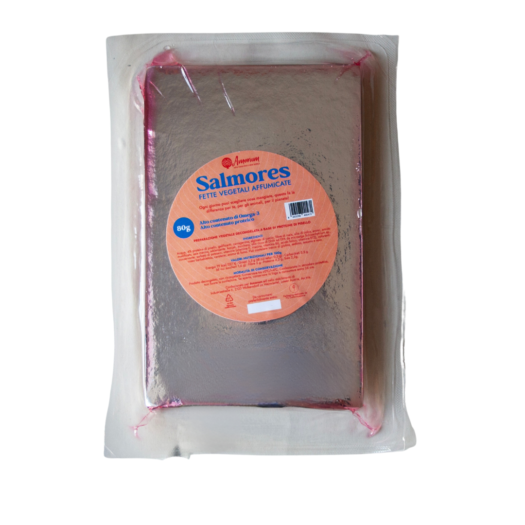 Acqua, proteine di piselli 6%, oli vegetali (olio di colza, olio di lino), gelificante: alginato di calcio, addensante: carragenina, konjac, aromi, sale marino, amido modificato, aromi naturali, concentrato di barbabietola, vitamine (vitamina B2, vitamina 6, vitamina b12, vitamina D2), pigmento: carotene.
